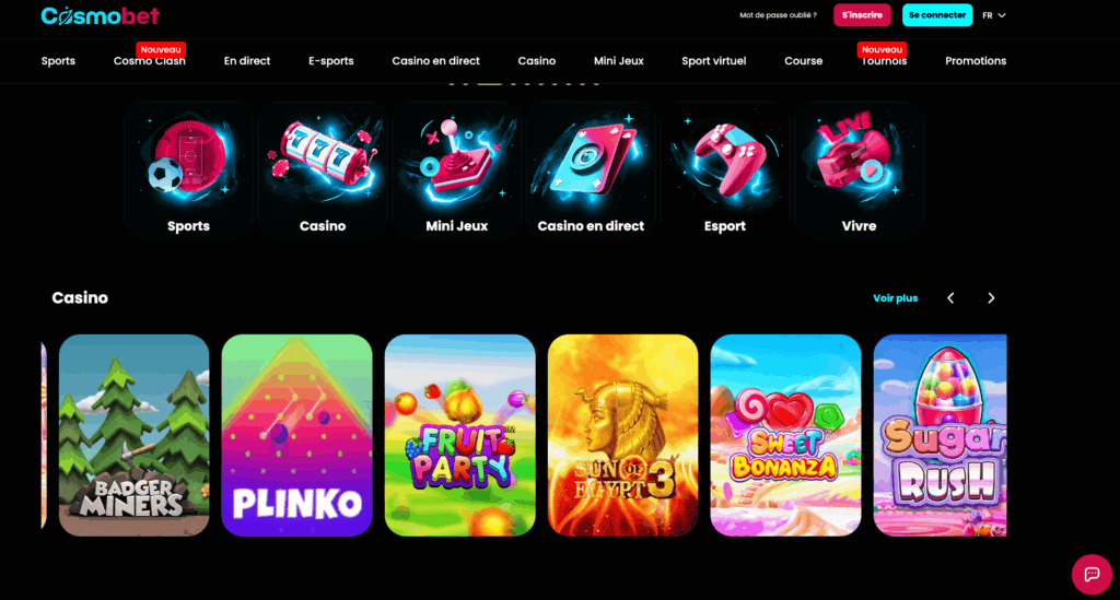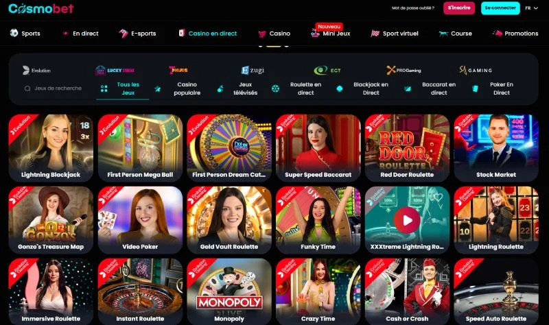 Cosmobet met en avant une ludothèque de 6 000+ jeux. On y retrouve des slots connues comme Book of Dead, Starburst, Sweet Bonanza, Wolf Gold, Gates of Olympus et Gonzo’s Quest Megaways, ainsi que du live casino avec Lightning Roulette et Crazy Time. Des mini-jeux comme Aviator, Plinko, Mines, Dice, Limbo et HiLo sont aussi affichés.